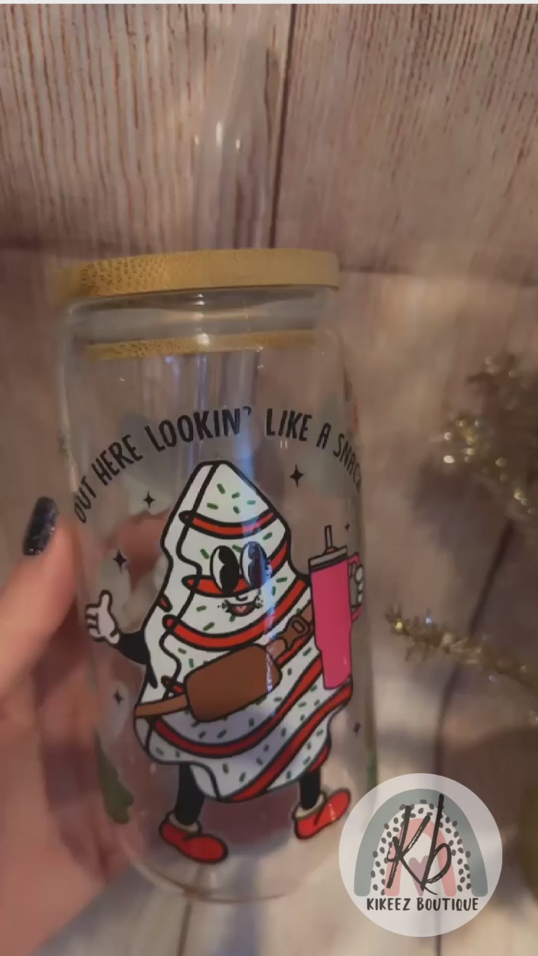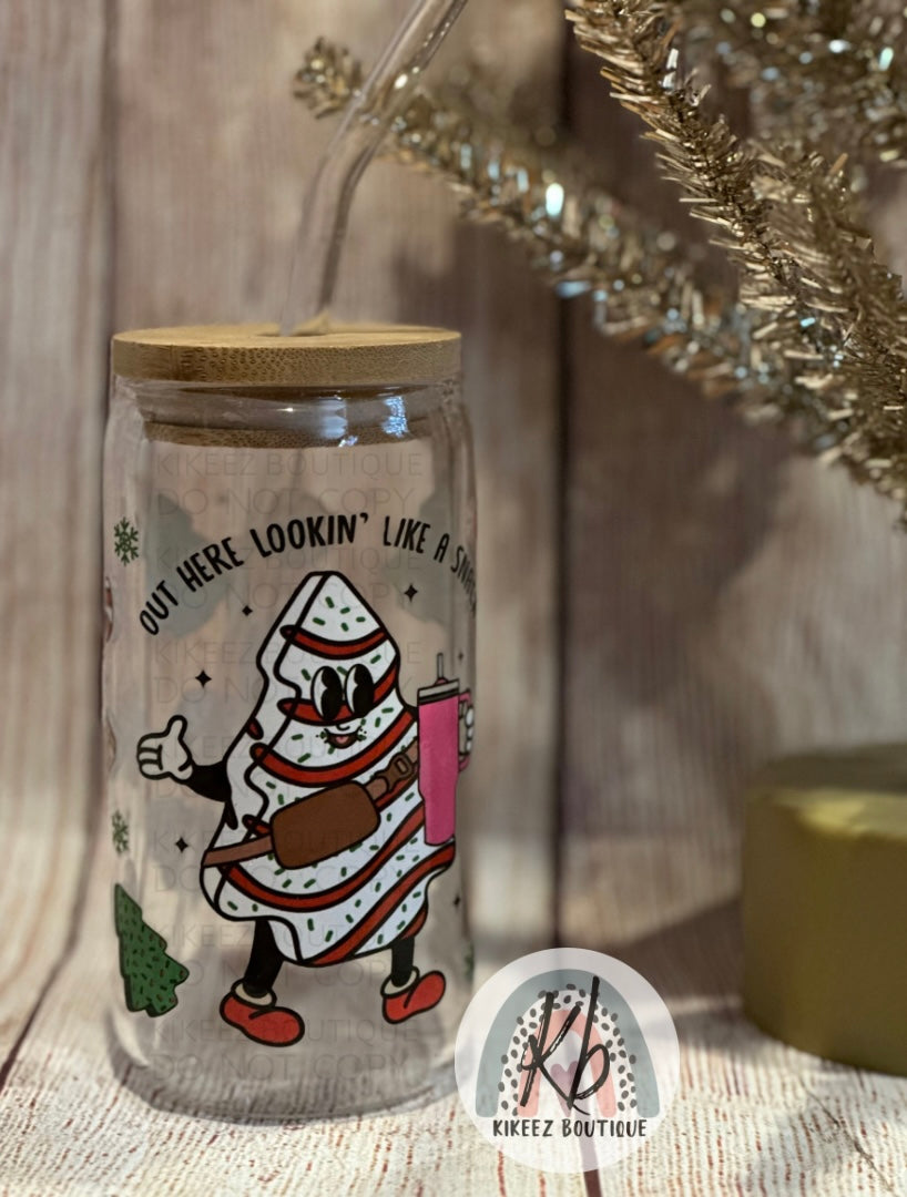 This Lookin Like a Snack Glass Cup is perfect for the holiday season. It features an exclusive Christmas-themed design on a glass beer can cup with a bamboo lid and glass straw, so you can enjoy your favorite drinks in style.